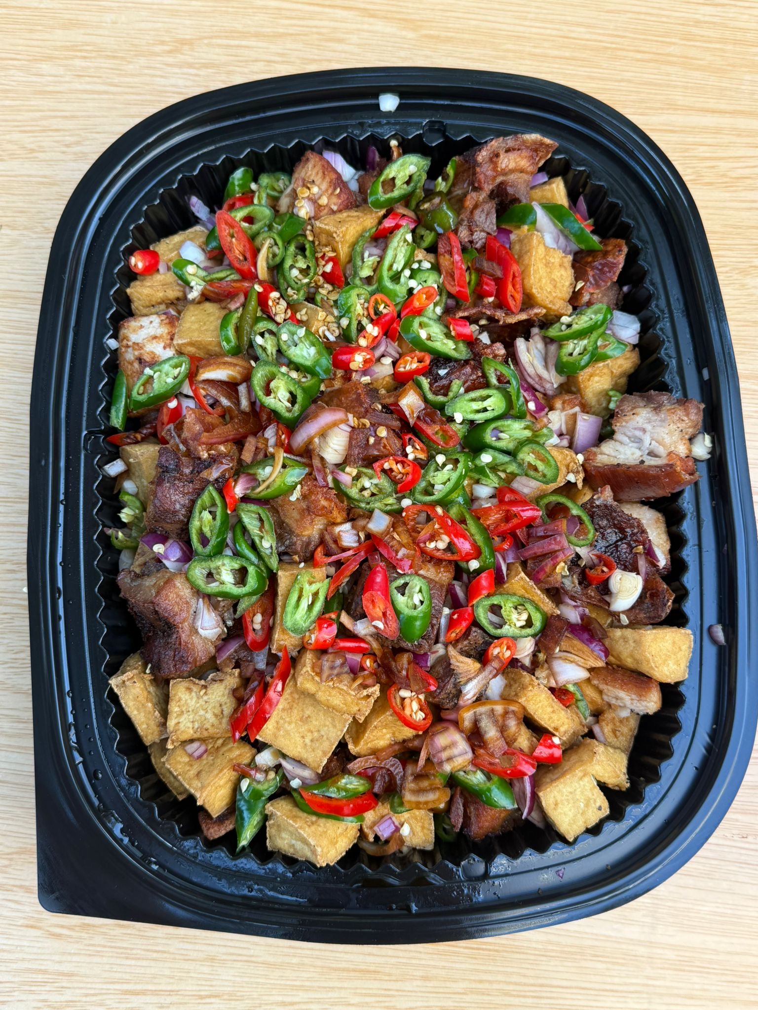 Crispy fried lechon and tofu cubes in spicy mixed soy and vinegar sauce